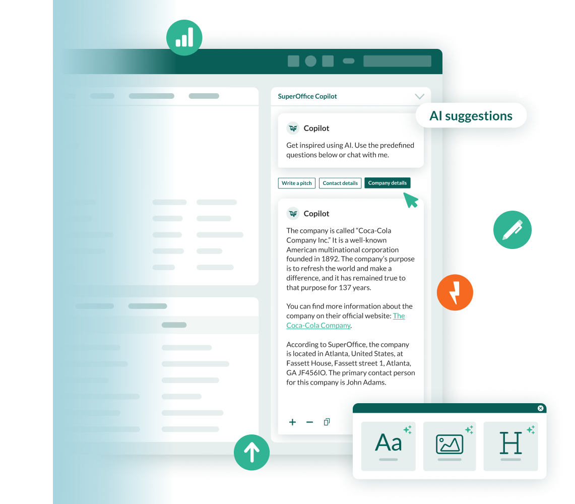 Erhalten Sie sofortige Zusammenfassungen von Ticketanfragen und zu Ihren Besprechungsterminen. Verschaffen Sie sich in Sekundenschnelle einen Überblick über Ihr gesamtes CRM. Generieren Sie personalisierte Vorschläge, Präsentationen und individuelle Kampagnenbilder. Noch nie war es so einfach, Ihr gesamtes Unternehmen zu unterstützen, bessere Beziehungen aufzubauen - jetzt mit Hilfe von KI in Ihrem SuperOffice CRM.