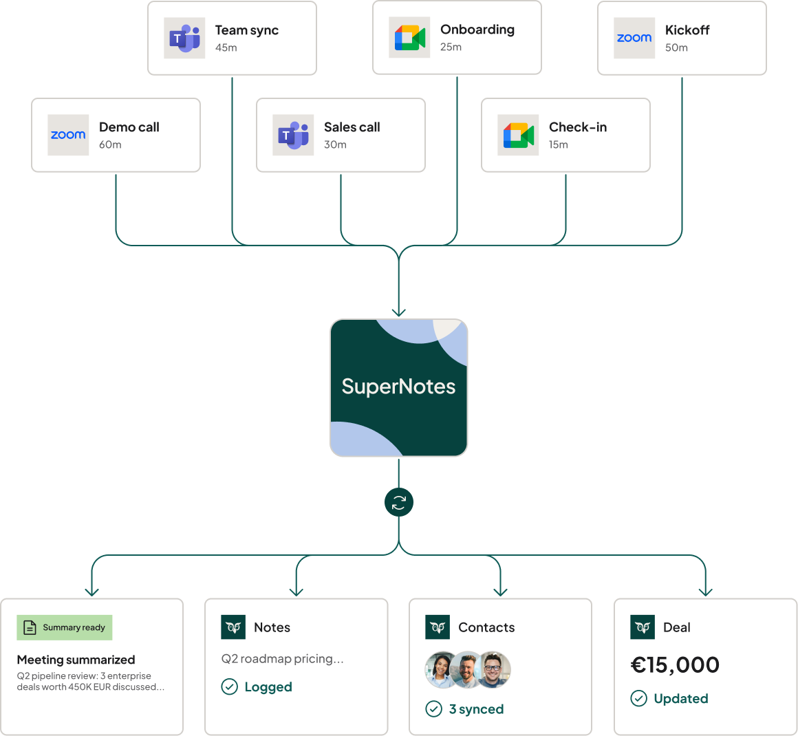 Meetings sind nicht das Problem – sondern die Arbeit drumherum. Vorbereitungen, Notizen, Follow-ups und CRM-Aktualisierungen beanspruchen jede Woche viel Zeit – häufig handelt es sich um dieselben Aufgaben, die von verschiedenen Personen wiederholt werden.
